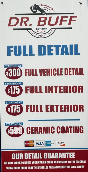 Dr. Buff offers quick and convenient auto detailing services. With no appointment needed, we provide multiple packages to choose from and guarantee satisfaction in 30 minutes or less. First come, first serve - get your car looking its best today!